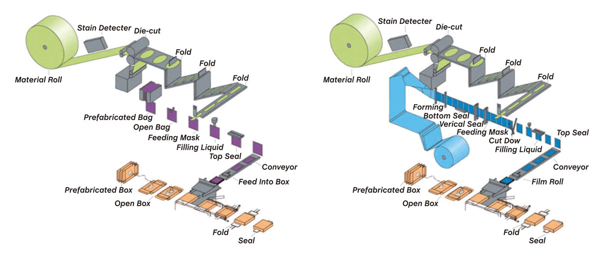 VPD400全自动面膜包装机(在线装袋) 满足医药级GMP生产设备要求,只需卷膜进料即可完成切膜成型、面膜折叠、在线制袋(或预制袋)、面膜入袋、添加液体、热封成袋等步骤,末端产出成品。